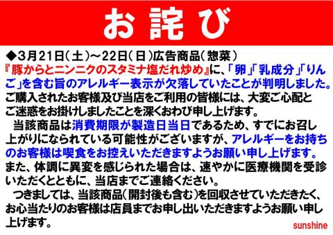 ◆3月21日(土)~22日(日)広告商品(惣菜)『豚からとニンニクのスタミナ塩だれ炒め』に、「卵」「乳成分」「りんご」…