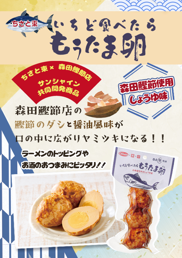 ちさと東×森田鰹節店×サンシャイン共同開発商品。森田鰹節店の鰹節のダシと醤油風味が口の中に広がりヤミツキになる!!ラーメンのトッピングやお酒のおつまみにピッタリ!!