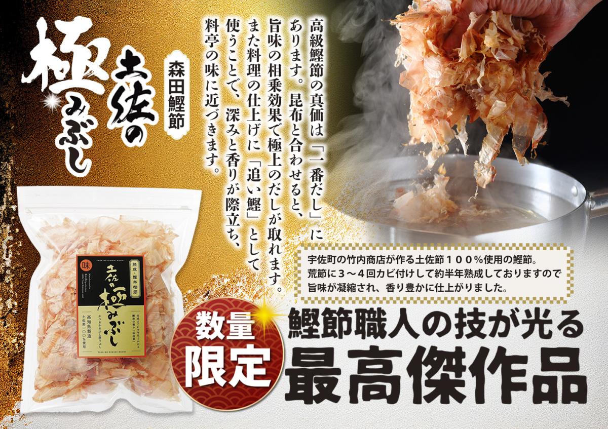 数量限定!鰹節職人の技が光る最高傑作品。高級鰹節の真価は「一番だし」にあります。昆布と合わせると、旨味の相乗効果で極上のだしが取れます。また、料理の仕上げに「追い鰹」として使うことで、深みと香りが際立ち、料亭の味に近づきます。宇佐町の竹内商店が作る土佐節100%使用の鰹節。荒節に3~4回カビ付けして約半年熟成しておりますので旨味が凝縮され、香り豊かに仕上がりました。