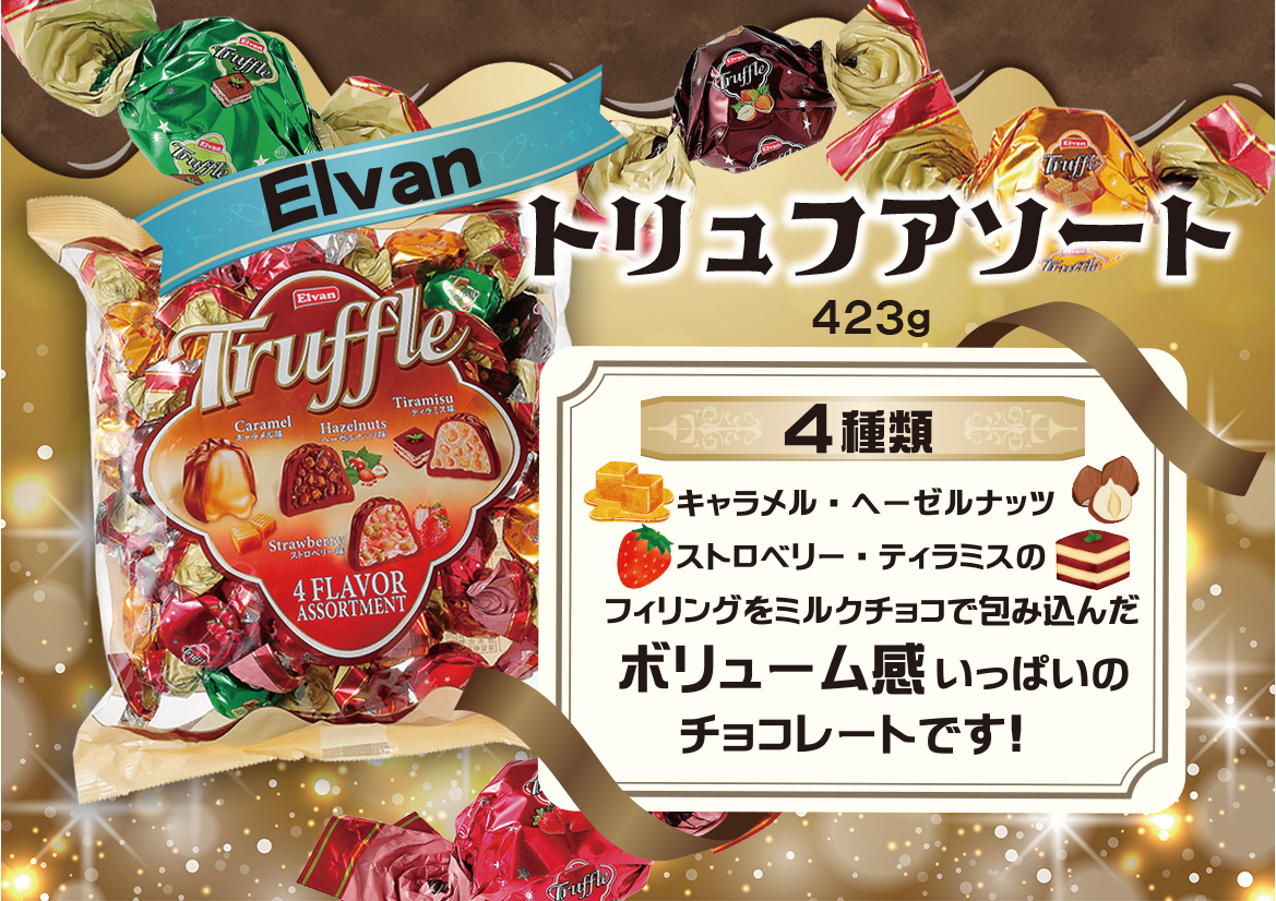 キャラメル・ヘーゼルナッツ・ストロベリー・ティラミスのフィリングをミルクチョコで包み込んだボリューム感いっぱいのチョコレートです!