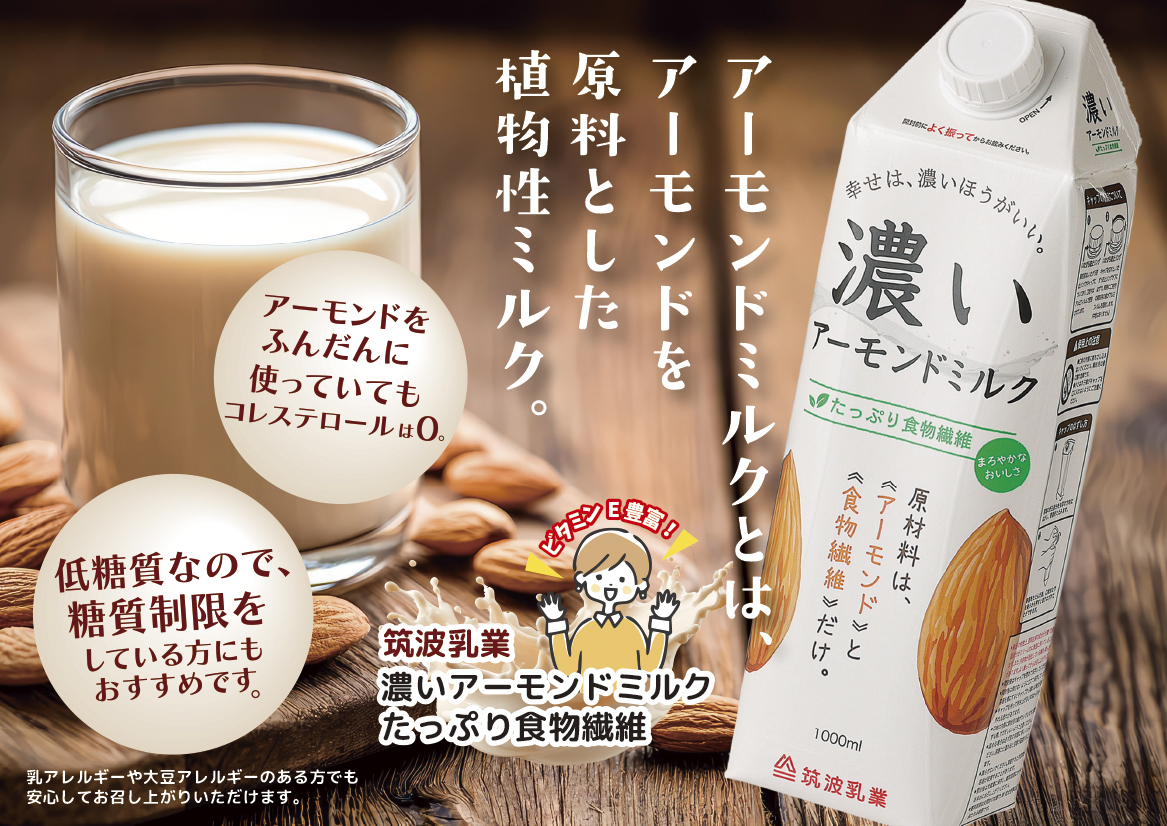 アーモンドミルクとは、アーモンドを原料とした植物性ミルク。アーモンドをふんだんに使っていてもコレステロールは0。低糖質なので、糖質制限をしている方にもおすすめです。乳アレルギーや大豆アレルギーのある方でも安心してお召し上がりいただけます。
