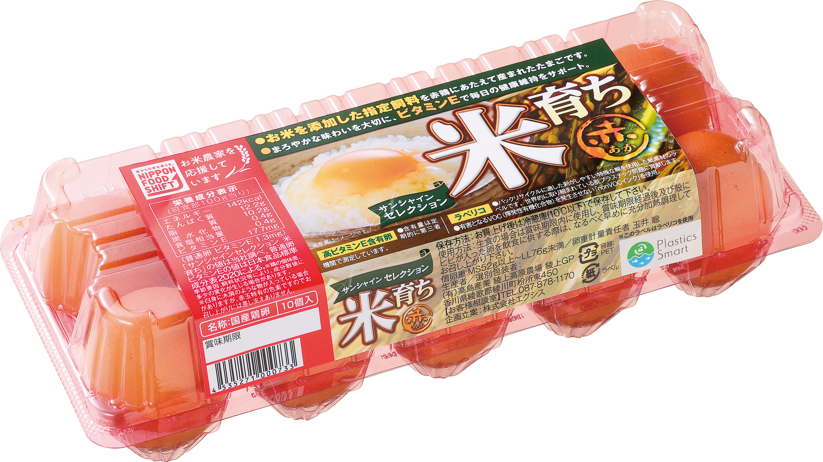 米育ち赤たまご 産地・メーカー サンシャインセレクション 米育ち赤たまご の続きを見る 餌となる飼料に米を3%~7%添加して赤鶏にあたえています。たまごの臭みを抑えてまろやかな味わいにしました。高ビタミンE含有。■栄養成分表示(可食部100g当り)・ビタミンE17.7mg(普通卵1.0mg) ※(財)日本食品分析センター調べ※鶏の個体差、季節要因、飼料状況等により、成分数値に多少の変化が生じる場合があります。